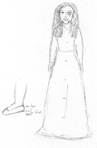 Didn't put much thought into her character design, either. Notes from model sheets: Head an OVAL 3 stitches (on left side of face--her right (side opposite the eyepatch)--dunno if that keeps up later or not; I don't think I was consistent...) Eyebrow shows over eyepatch (oops) Hair sporadically wavy/curly One of the few full body shots of Fox Tales characters I did that isn't totally AWFUL... (dunno if the shoe comment applies) Reference pictures: She has a pretty good resemblance to Joan Osborne, a singer who was popular a few years back (when I was working on Fox Tales in earnest). Except Joan doesn't have scars, and Heather doesn't have a nose ring. ^_- (Nor does she pluck her eyebrows quite like that...) Heather's nose is narrower than Joan's is in Picture 2. |