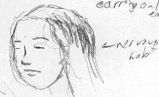 It's always hard for me to figure out what Jeremy's supposed to look like. He has a haircut not found in nature. ^_- Notes from the model sheets: Do NOT forget chin! (Good advice... ^_-;;;) About the same shape as Heather's face Usually wide-eyed Bangs VERY sporadic Eyebrows brown; not thick Usually looks childlike (didn't pull that off, eh? ^^;) Reference pictures: The first one is from "My So Called Life" (which I never really watched)--I think it's the nerdy guy no one likes. ^_^;;; The profile's not too bad for Jeremy, though... The second one's from...uh...a movie, I think. ^^; Neither picture is a striking resemblance at all...(I think I had the second one for the hair? Although Jeremy has BANGS, you know...) |