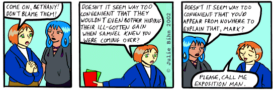 Yeah, I should have some stirring words of wisdom here, but I don't. Sorry! I guess I could explain why this installment was late--but it was pretty much only because I was lazy and didn't feel like drawing. ^^; Plus I was "yarning" with someone Sunday night...^_^;